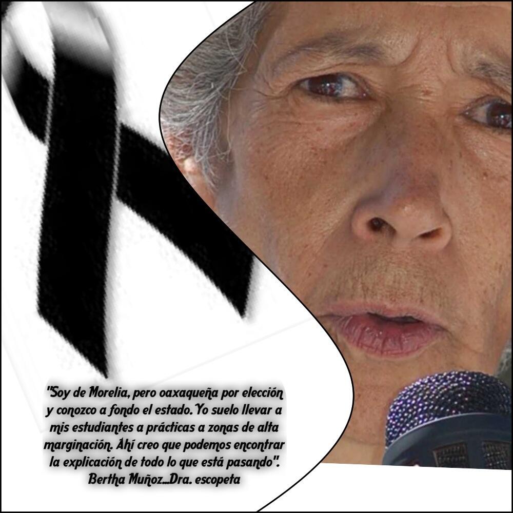 "Si están viendo esto es porque ya no estoy, muero tranquila… la vida no me debe nada, ni yo le debo a la vida… amo Oaxaca por encima de todas las cosas", fueron las últimas palabras que familiares, amigos de lucha y todo aquel que se sintió identificado con la doctora Bertha Muñoz Mier, mejor conocida como "la doctora escopeta" escucharon a través de un video, la mañana de este día, durante la velación del cuerpo.